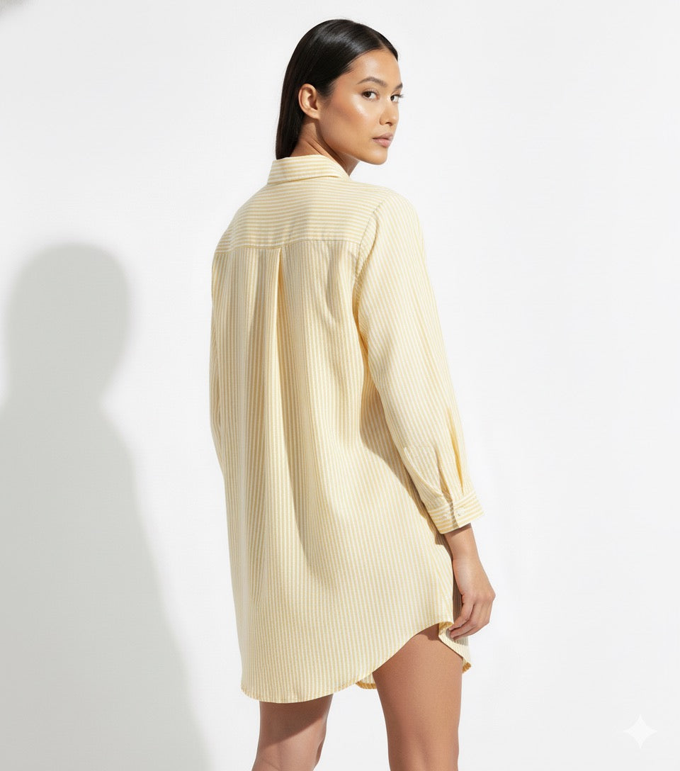 Elevate your casual collection with this ultra-wearable yellow stripe over shirt. Its relaxed, roomy fit makes it the ultimate piece for effortless layering.