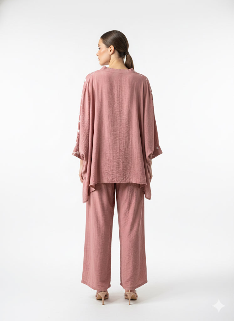 Meet your new favorite grab-and-go outfit. This incredibly comfortable set includes a stunning oversized top featuring elegant tone-on-tone embroidery for a sophisticated touch. The matching pull-on trousers boast a fashionable crinkle texture and a loose, wide-leg design, maximizing both style and movement. The elasticated waist ensures a perfect, easy fit. It’s the ultimate combination of cozy loungewear feel and dressy appeal.