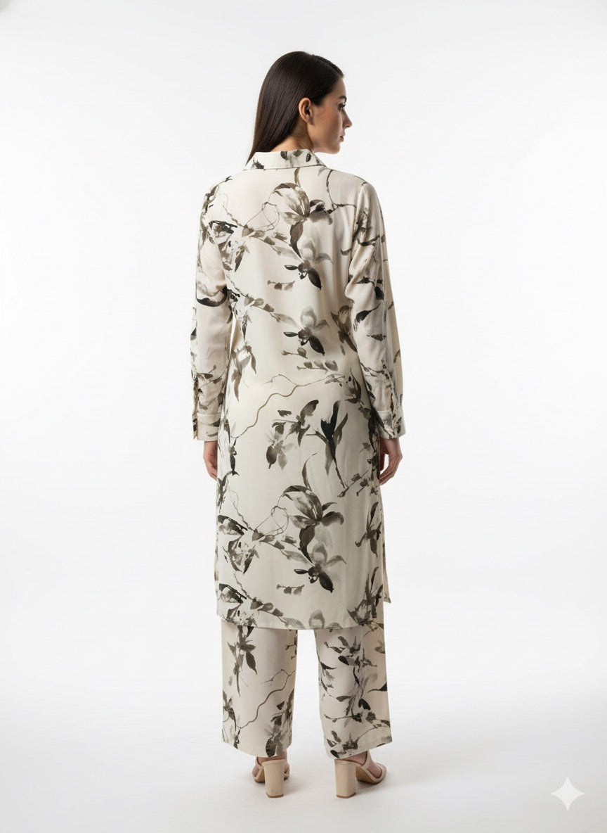 Step out in sophisticated style with this striking two-piece code set. Featuring a long, flowing, button-down shirt kurta and matching wide-leg trousers in a soft cream hue, this ensemble is adorned with a bold, charcoal and black hand-painted floral print. The long-line tunic has a classic shirt collar and a relaxed, comfortable fit, making it a versatile choice for both daytime events and elegant evenings. Pair it with your favorite heels for an effortlessly