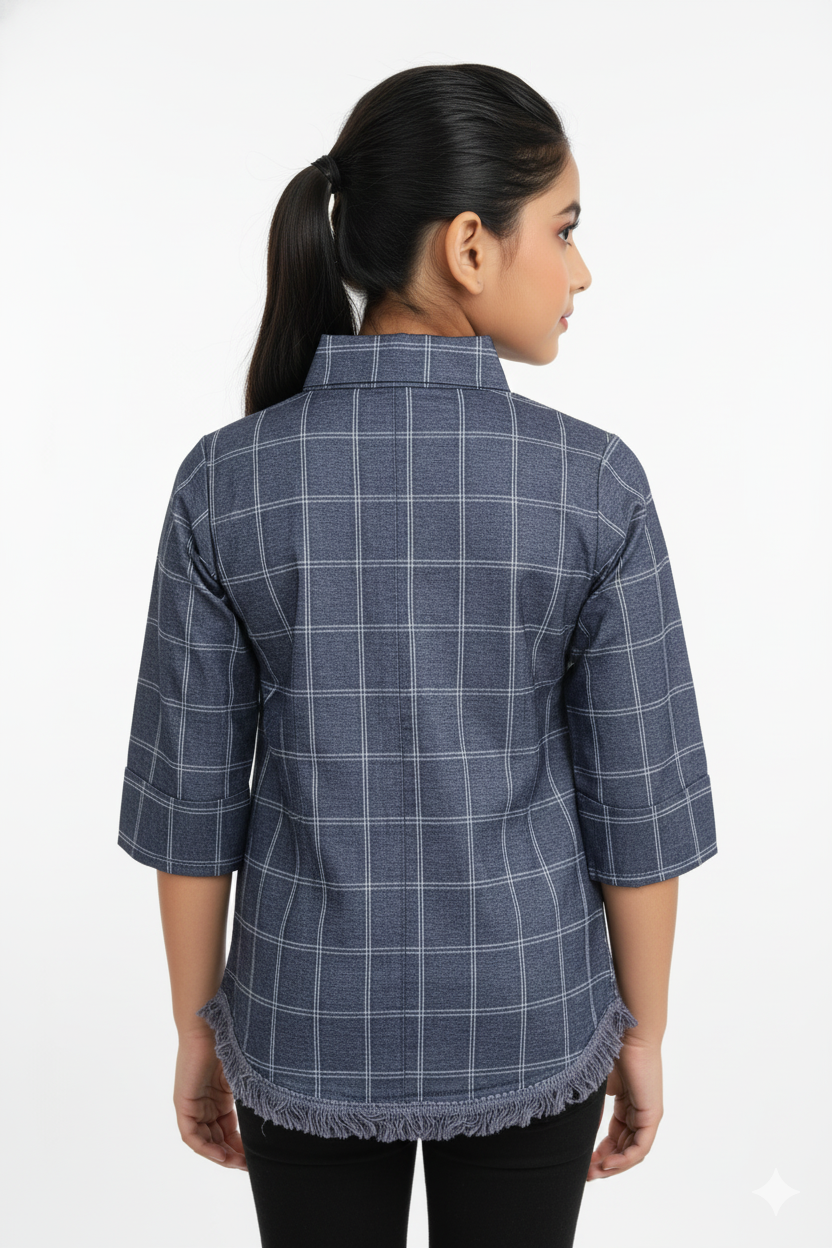 Key Features: Soft denim fabric, blue checkered print, star stud details, long sleeves with button cuffs, and a fashionable frayed hem.
