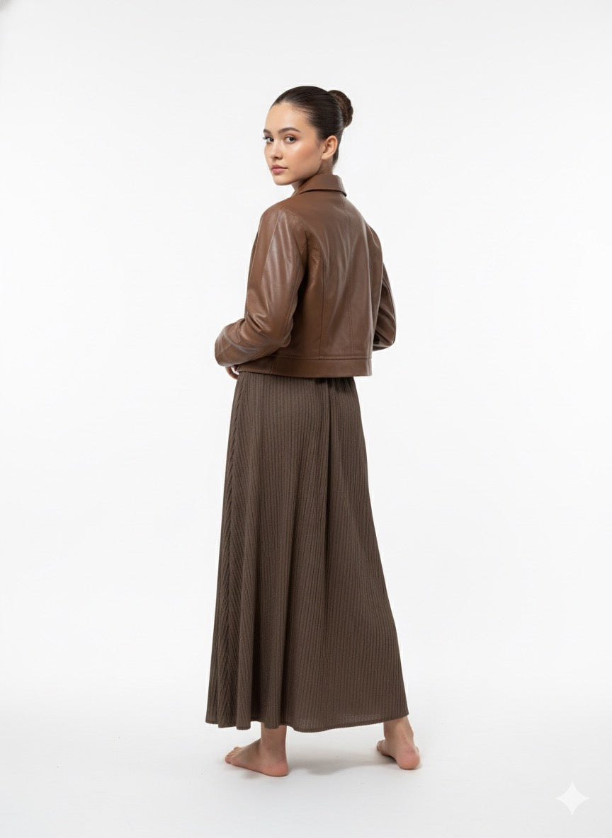 This coordinated outfit features a rich brown faux leather cropped biker jacket paired with an elegant, long textured knit maxi skirt. It’s the ideal blend of edgy and modest, making it a standout addition to any young girl's wardrobe